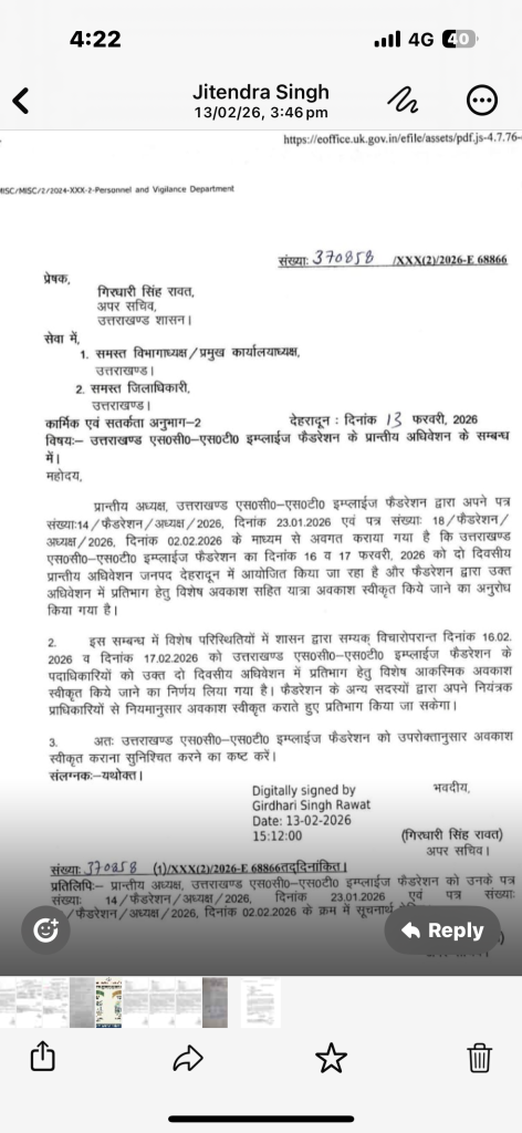 प्राप्त जानकारी के अनुसार फेडरेशन का प्रांतीय अधिवेशन दिनांक 16 एवं 17 फरवरी 2026 को देहरादून जनपद में आयोजित किया जा रहा है। इस संबंध में फेडरेशन के प्रांतीय अध्यक्ष द्वारा शासन को पत्र प्रेषित कर अधिवेशन में प्रतिभाग करने वाले पदाधिकारियों के लिए विशेष अवकाश स्वीकृत किए जाने का अनुरोध किया गया था।निर्णय लिया गया है। वहीं, फेडरेशन के अन्य सदस्य अपने-अपने नियंत्रक प्राधिकारियों से नियमानुसार अवकाश स्वीकृत कराते हुए अधिवेशन में प्रतिभाग कर सकेंगे।